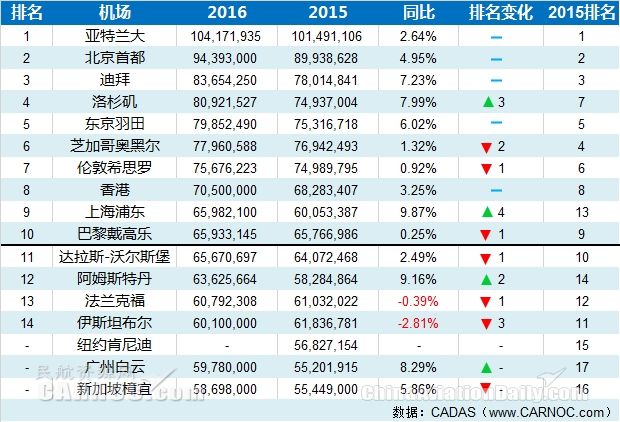 民航資源網2017年2月7日消息:所謂“文無第一,武無第二”,旅客吞吐量無疑是全球各大機場展示實力的一項重要指標。根據CADAS整理的2016國際機場初步數據,亞特蘭大國際機場再度蟬聯全球最繁忙機場的桂冠。