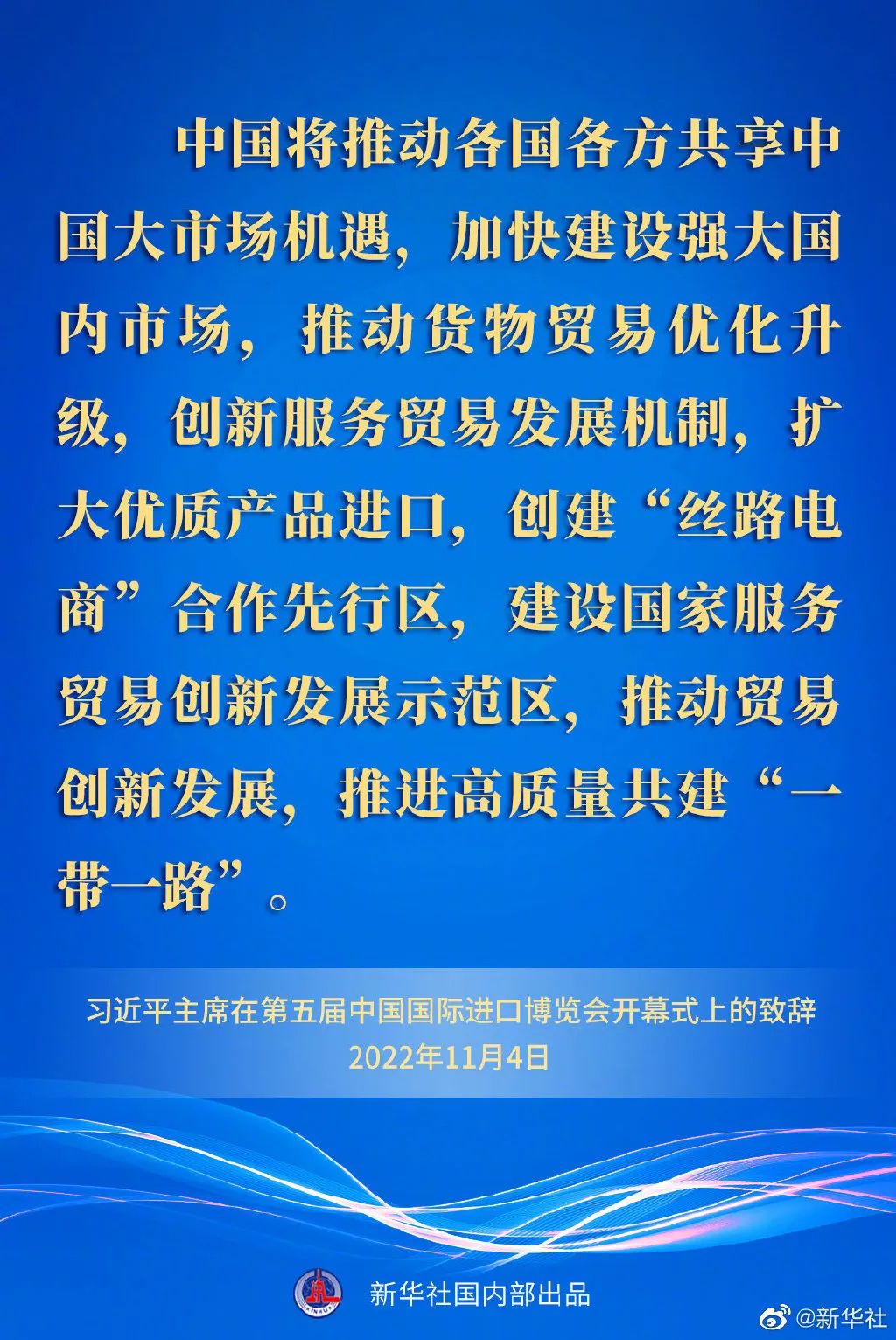 ——中國將推動(dòng)各國各方共享中國大市場機(jī)遇,加快建設(shè)強(qiáng)大國內(nèi)市場,推動(dòng)貨物貿(mào)易優(yōu)化升級(jí),創(chuàng)新服務(wù)貿(mào)易發(fā)展機(jī)制,擴(kuò)大優(yōu)質(zhì)產(chǎn)品進(jìn)口,創(chuàng)建“絲路電商”合作先行區(qū),建設(shè)國家服務(wù)貿(mào)易創(chuàng)新發(fā)展示范區(qū),推動(dòng)貿(mào)易創(chuàng)新發(fā)展,推進(jìn)高質(zhì)量共建“一帶一路”。