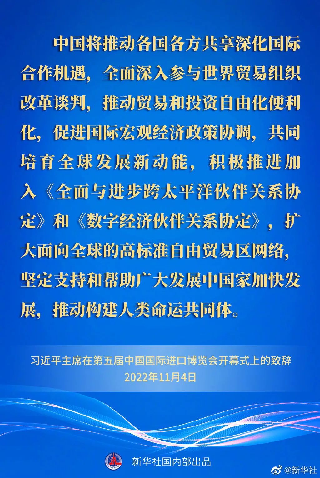 ——中國將推動(dòng)各國各方共享深化國際合作機(jī)遇,全面深入?yún)⑴c世界貿(mào)易組織改革談判,推動(dòng)貿(mào)易和投資自由化便利化,促進(jìn)國際宏觀經(jīng)濟(jì)政策協(xié)調(diào),共同培育全球發(fā)展新動(dòng)能,積極推進(jìn)加入《全面與進(jìn)步跨太平洋伙伴關(guān)系協(xié)定》和《數(shù)字經(jīng)濟(jì)伙伴關(guān)系協(xié)定》,擴(kuò)大面向全球的高標(biāo)準(zhǔn)自由貿(mào)易區(qū)網(wǎng)絡(luò),堅(jiān)定支持和幫助廣大發(fā)展中國家加快發(fā)展,推動(dòng)構(gòu)建人類命運(yùn)共同體。
