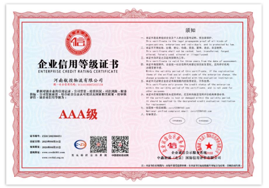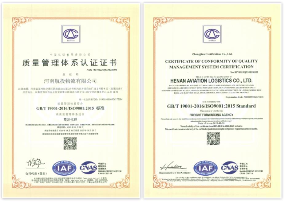 近日,航投物流通過GB/T 19001-2016/ISO 9001:2015質(zhì)量管理體系認(rèn)證審核,榮獲ISO質(zhì)量管理體系認(rèn)證證書,同時(shí)獲得了企業(yè)信用的最高評(píng)定——AAA級(jí)企業(yè)信用等級(jí)證書,被授予“十證一牌”。喜獲雙重肯定,意味著航投物流在行業(yè)綜合競(jìng)爭(zhēng)中邁上新臺(tái)階,是對(duì)其高效業(yè)務(wù)流程、標(biāo)準(zhǔn)化經(jīng)營、規(guī)范化管理模式的肯定。