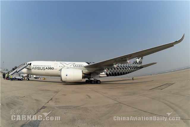11月2日一架身披碳纖維特殊涂裝的空客A350-900測試飛機飛抵北京首都國際機場,并在11月3日進行展示。A350是目前世界上最先進的遠程寬體飛機。北京是空客A350中國巡演活動的第三站,之前這架生產序列號為MSN2的測試飛機已經訪問了珠海和海口,接下來它還將飛抵上海、廣州和成都進行靜態和飛行展示。