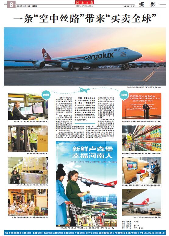 在8次報(bào)道中,既有會(huì)前的“熱身”宣傳,又有會(huì)中的集中點(diǎn)擊,還有會(huì)后的回顧追蹤,形成系列,精彩紛呈。13日,《河南日報(bào)》以圖文并茂的整版篇幅,對河南航投與盧貨航的合作,尤其是“新鮮盧森堡”雙向跨境E貿(mào)易進(jìn)行了詳細(xì)報(bào)道。整個(gè)報(bào)道以新聞攝影為主,既有盧貨航“鄭州號(hào)”波音747-8F全貨機(jī),也有鄭-盧航線的專業(yè)操作流程展示,還有河南百姓采購“新鮮盧森堡”商品的真實(shí)場景……以鄭盧“雙樞紐”為典型案例,圍繞“一條‘空中絲路’帶來‘買賣全球’”這一主題,生動(dòng)展現(xiàn)了河南省依靠藍(lán)天對外開放的新思路和新成就。