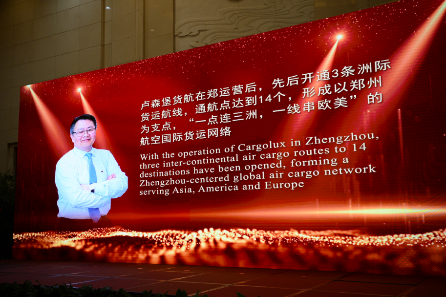 張明超在向盧貨航的代表表示祝賀時說,盧貨航與河南航投的合作一直穩步向前,截至8月31日,2018年盧森堡貨航在鄭航線累計執飛航班474班,貢獻貨運量7.98萬噸,航班密度由2014年開航時的每周2班加密至現在的每周18班,累計國際貨運量、國際貨運航線數、國際航班數量、國際通航點等主要指標均躍居鄭州機場首位,為鄭州貨運樞紐的建設增添了動力,查德·福森為此做出了突出貢獻,希望今后雙方繼續努力,攜手推動鄭盧“空中絲綢之路”的建設再創佳績。