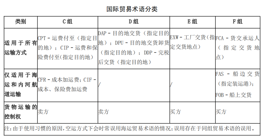 在國際貿易的貨物銷售合同中,進出口商使用國際商會《國際貿易術語解釋通則》(Incoterms),界定買賣雙方在風險、成本、運輸和保險方面的義務,避免誤解、爭議與因此導致的損失以及其他法律難題。根據最新的《國際貿易術語解釋通則》2020版,國際貿易術語共分成2類4組11個。